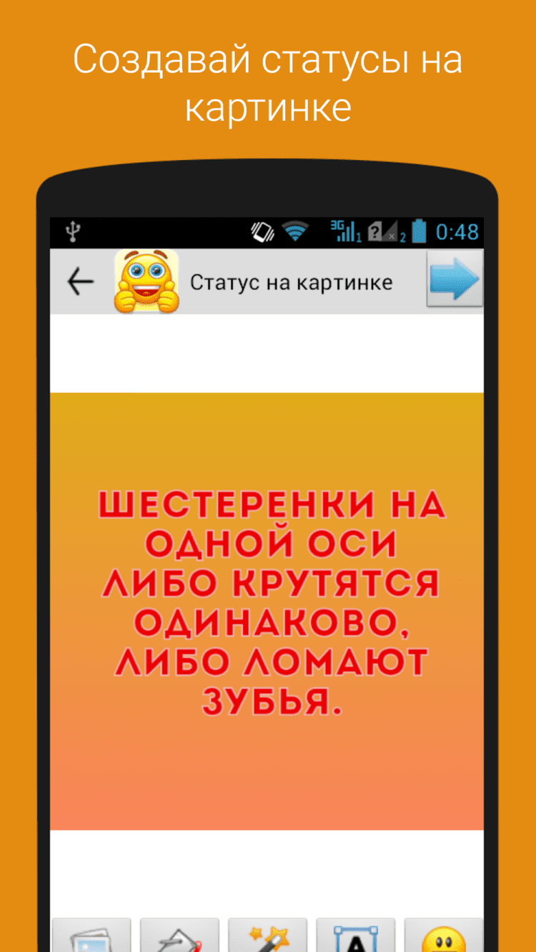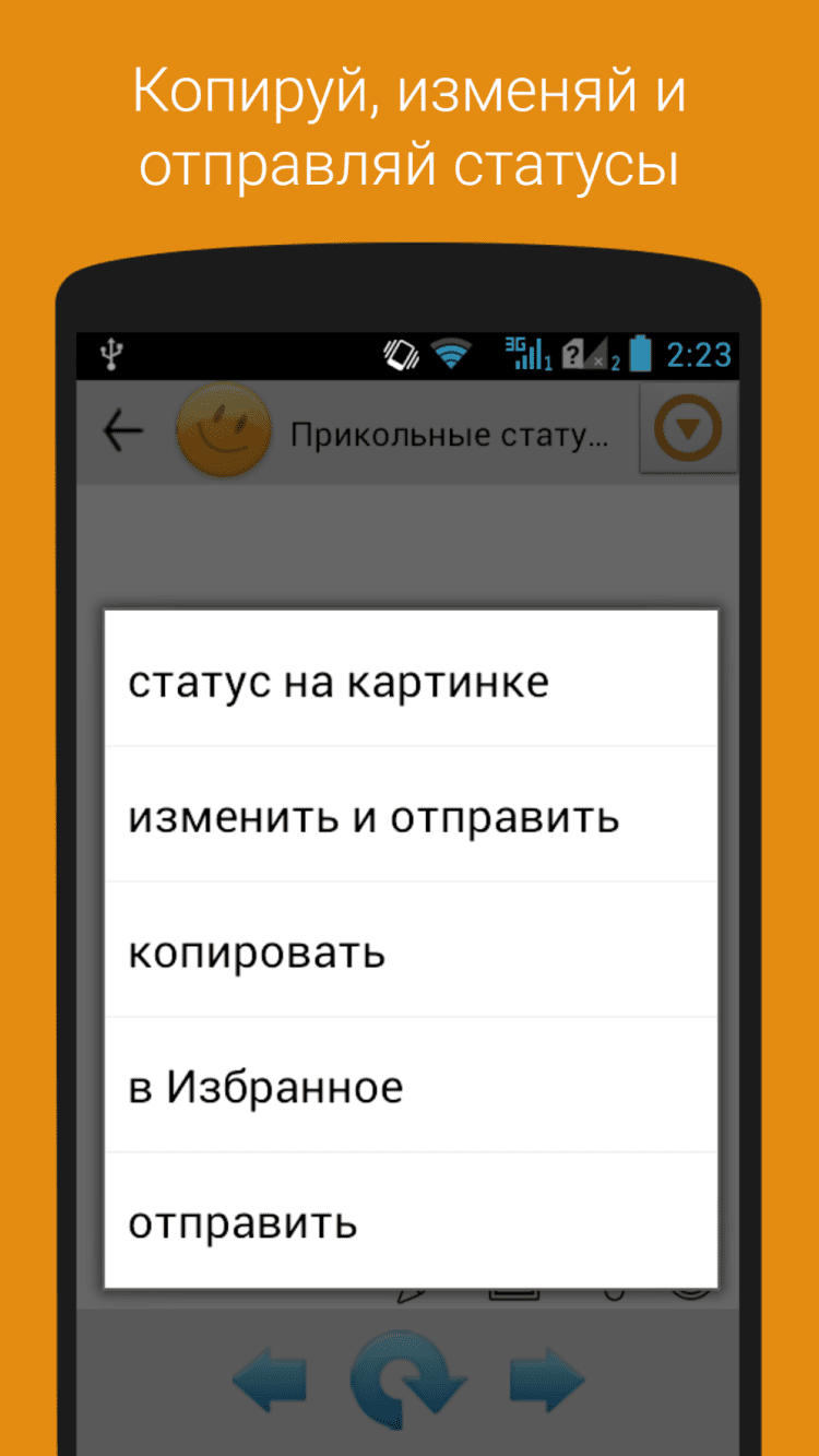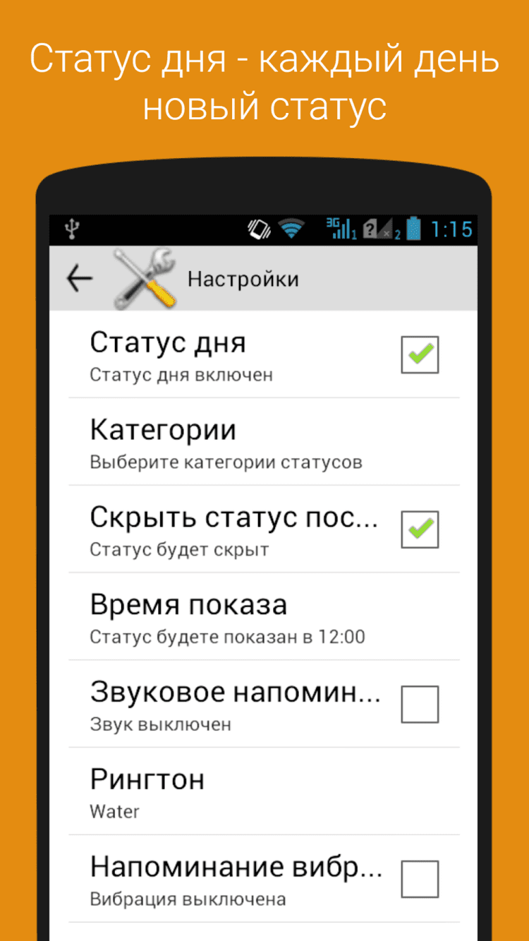- передавать любой статус в стороннее приложение, например, в текстовый редактор или в приложение для отправки смс;