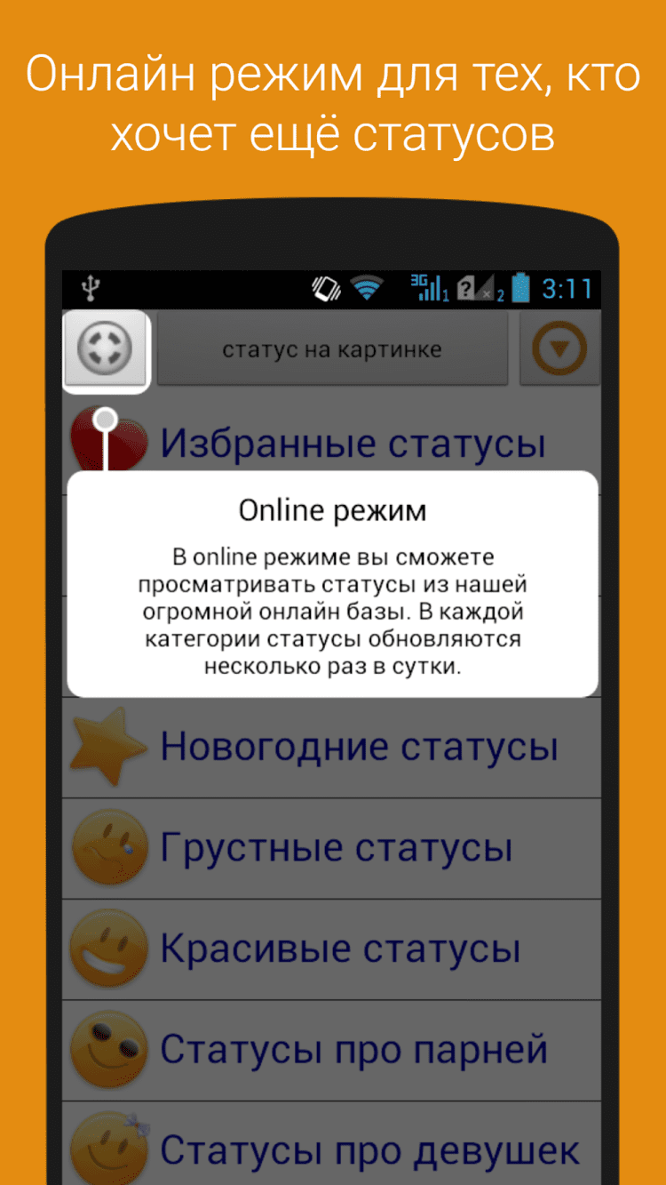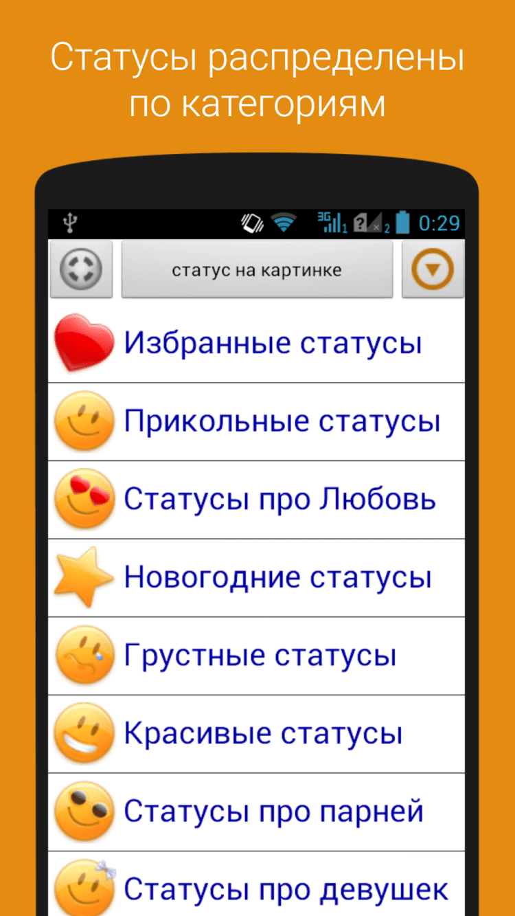 Все статусы распределены по 10 категориям: Прикольные статусы, Статусы про Любовь, Новогодние статусы, Грустные статусы, Красивые статусы, Статусы про парней, Статусы про девушек, Статусы со смыслом, Статусы про жизнь, Смешные статусы, Статусы про друзей.