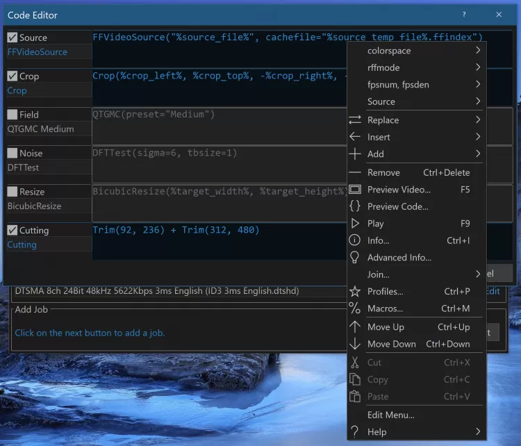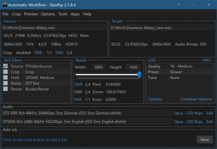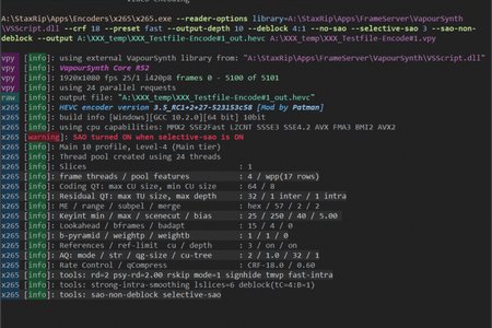 StaxRip - это мощный кодировщик аудио/видео файлов с графическим интерфейсом и открытыми исходным кодом. Он использует такие консольные приложения, как x265, mkvmerge, ffmpeg, и пр., а так же фреймсерверы AviSynth+ и VapourSynth для обработки видео.