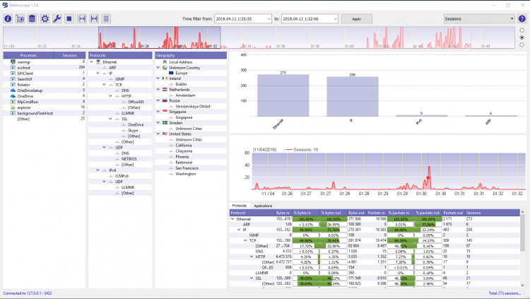 Стетоскоп Free — это бесплатный программный анализатор (x86/AMD64) для контроля сетевого трафика компьютеров локальной сети и сети Интернет. Весь трафик сохраняется и индексируется, что позволяет проводить как ретроспективный анализ, так и анализ в реальном времени по накопленным данным на диске и в базе данных. Поддерживаются геолокация и определение большого количества протоколов прикладного уровня. Реализована гибкая система фильтрации статистики трафика, позволяющая получать срезы по различным атрибутам накопленных данных и расследовать сетевые аномалии.
