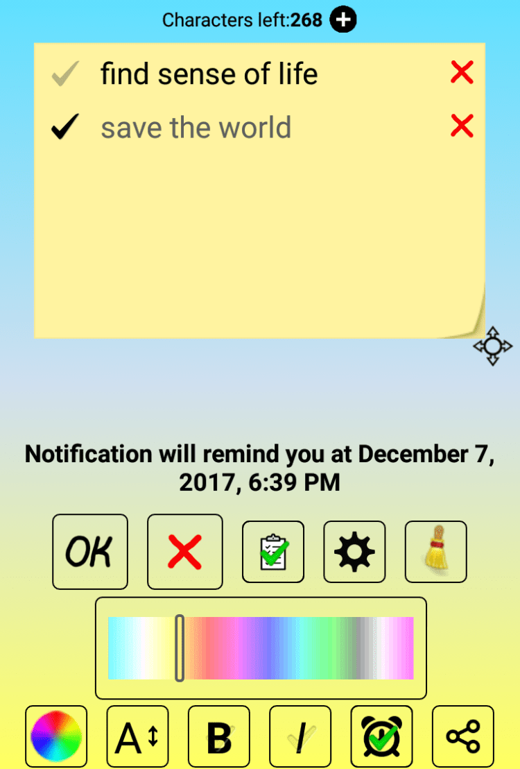Стикер - приложение, обладающее функционалом маленьких разноцветных листов бумаги с возможностью приклеивания на холодильник. Вы можете написать короткое сообщение и поместите его на домашний экран. Будьте кратки, кусочек бумаги мал, он вмещает только 100 символов, а размер шрифта изменяется автоматически. Количество наклеек ограничено только размером экрана. Чтобы изменить наклейку после создания, просто нажмите на нее.