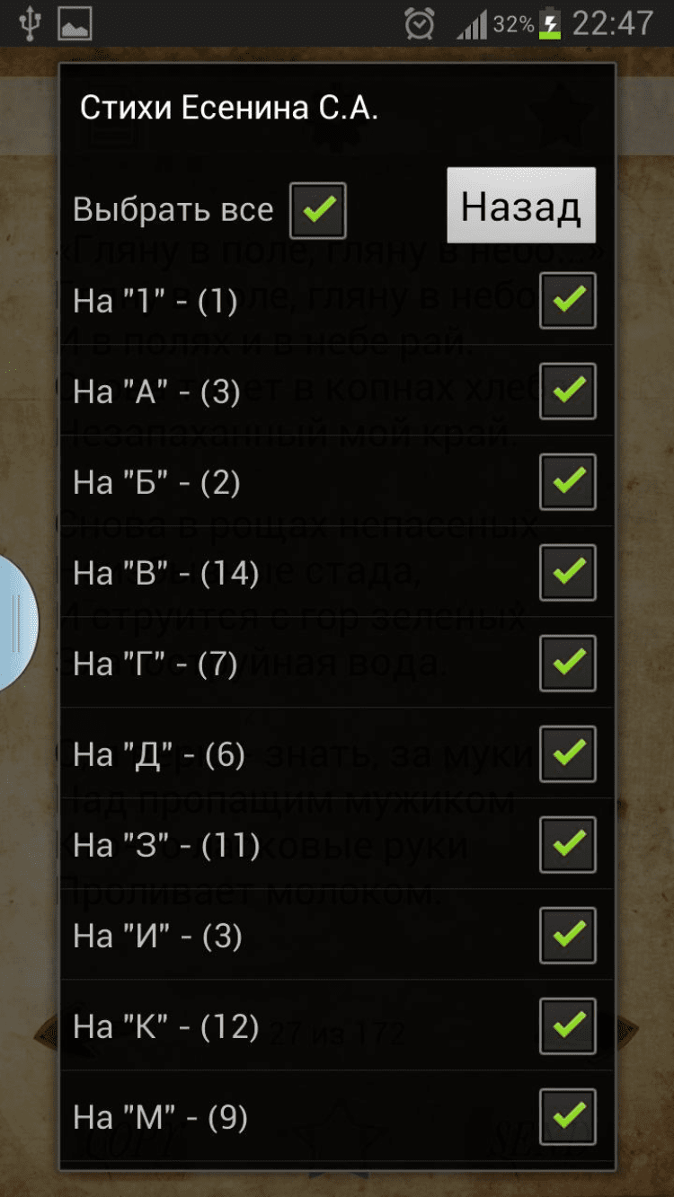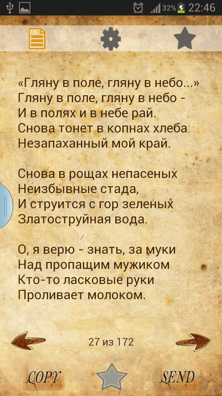Стихи Есенина С.А. Этот сборник содержит 172 стихотворения Есенина Сергея Александровича. Приложение запоминает текущее стихотворение и вам не придется начинать все сначала. Вы также можете добавить понравившееся стихотворение в избранное, скопировать, отправить sms, на вконтакте или другие приложения.