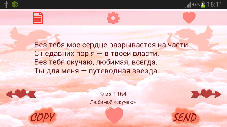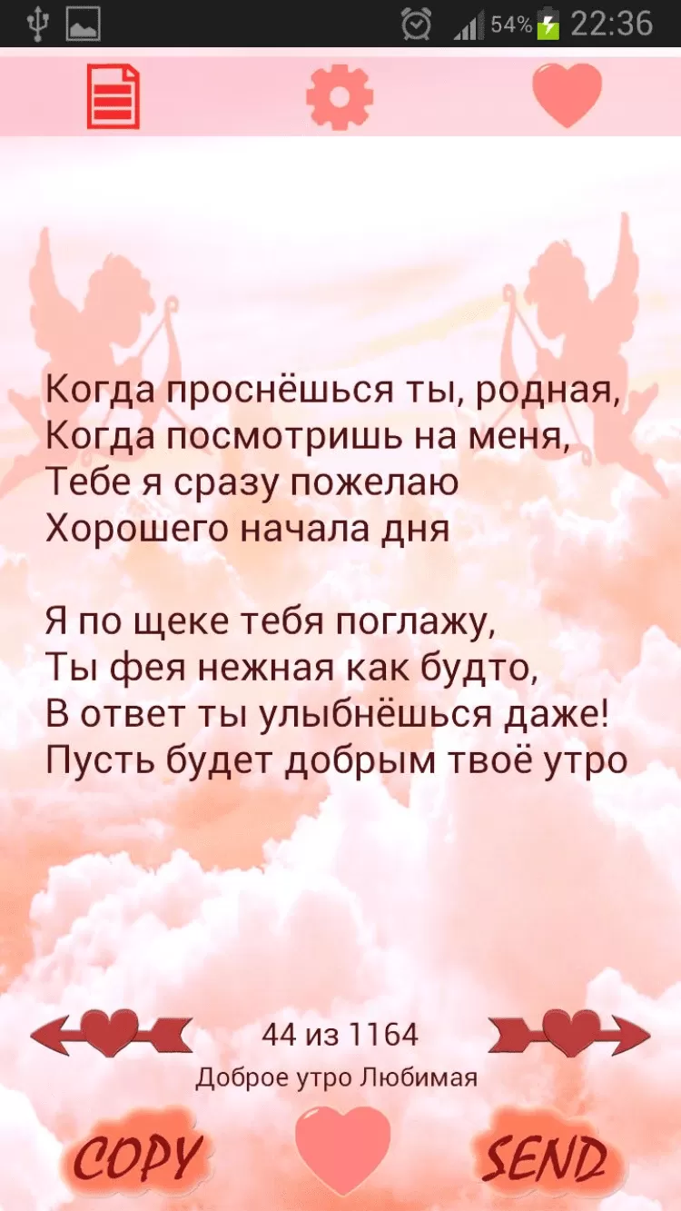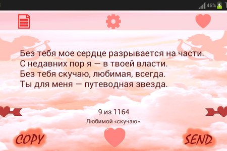 Стихи, СМС любимому и любимой - это приложение, которое поможет вашей любви стать крепче. Этот сборник содержит более 1100 стихов, пожеланий для любимого и любимой. Приложение запоминает текущее стихотворение (пожелание), и вам не придется начинать все сначала. Вы также можете добавить понравившийся стих (пожелание) в избранное, скопировать, отправить СМС любимому или любимой, через ВКонтакте или другие приложения.
