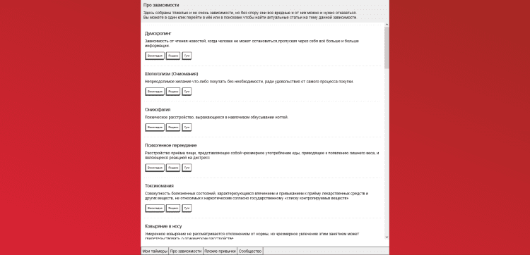 Программа имеет сервер в дискорде и предлагает присоединиться к сообществу людей, которые хотят победить зависимости и плохие привычки которые у них есть.