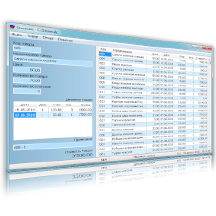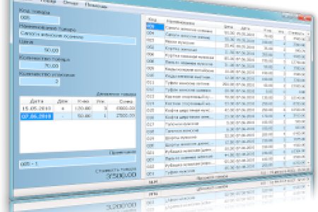Storecalc Предельно простая складская программа, складской калькулятор. Позволяет организовать элементарный складской учет для небольшого собственного дела. Программа не печатает бухгалтерских документов типа накладных, ее предназначение — вести учет на складе “для себя”. Всего несколько нажатий клавиш и выполняются следующие действия: - добавление товара на склад - отнимание товара со склада - изменение цены товара - поиск товара - сортировка списка товаров - просмотр движений товара - удаление товара со склада - некоторые другие действия… В главном окне отображается список товаров на складе, список движений и поля для ввода информации о товаре. Программа сохраняет код, наименование, цену, дату последнего движения товара и остатки на складе (количество товара, стоимость). Для каждого товара сохраняются все его движения. Выполняемые действия подробно описаны в справке по работе с программой. Программа разработана для неподготовленных пользователей и оптимизирована для работы с ноутбуком.