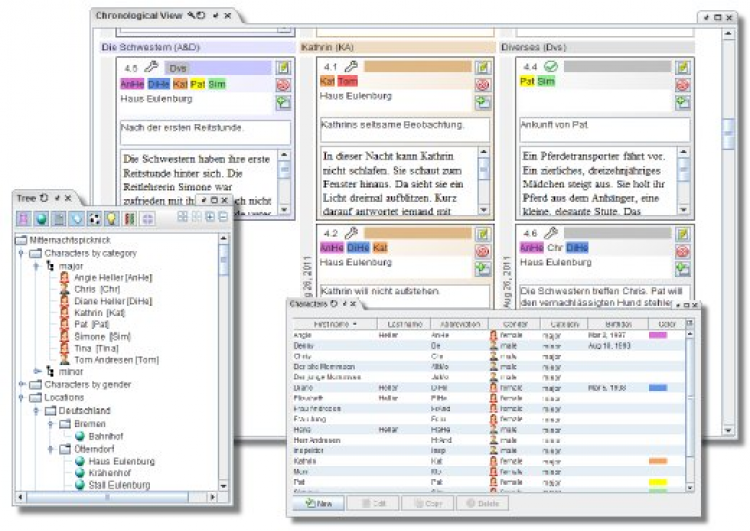 Программа позволяет сортировать эпизоды (сцены) романа по внутренней хронологии и сюжетным линиям, поддерживает базу персонажей и локаций, размещать готовые или запланированные сцены в главах романа и т. д.