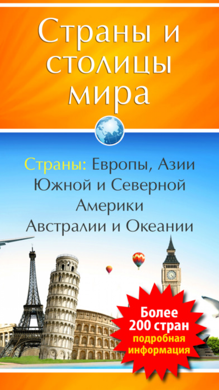 Страны Мира Все страны мира в одном приложении. Население, культура, достопримечательности, валюта, географическое положение, политическое устройство, города, столица, климат, язык, таможенные правила и множество другой полезной информации. Страны Европы, Азии, Северной и Южной Америки и Австралия.
