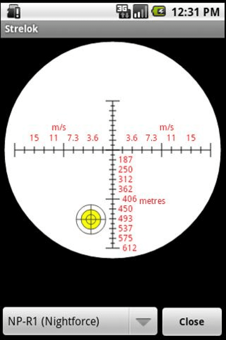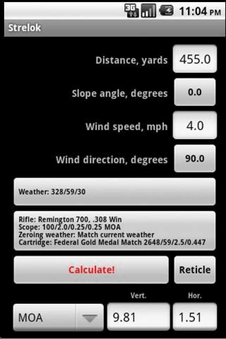 Введите параметры, нажмите кнопку "Рассчитать", и вы получите вертикальную и горизонтальную поправки для оптического прицела. Кроме того, вы можете выбрать прицельную марку (сетку) из списка и увидеть вертикальную и горизонтальную поправку для стрельбы выносом. Вы можете отправить по электронной почте и изображение сетки и баллистическую таблицу.