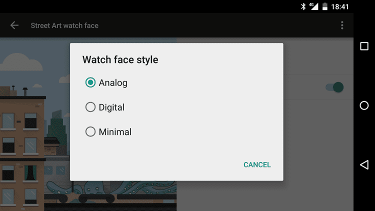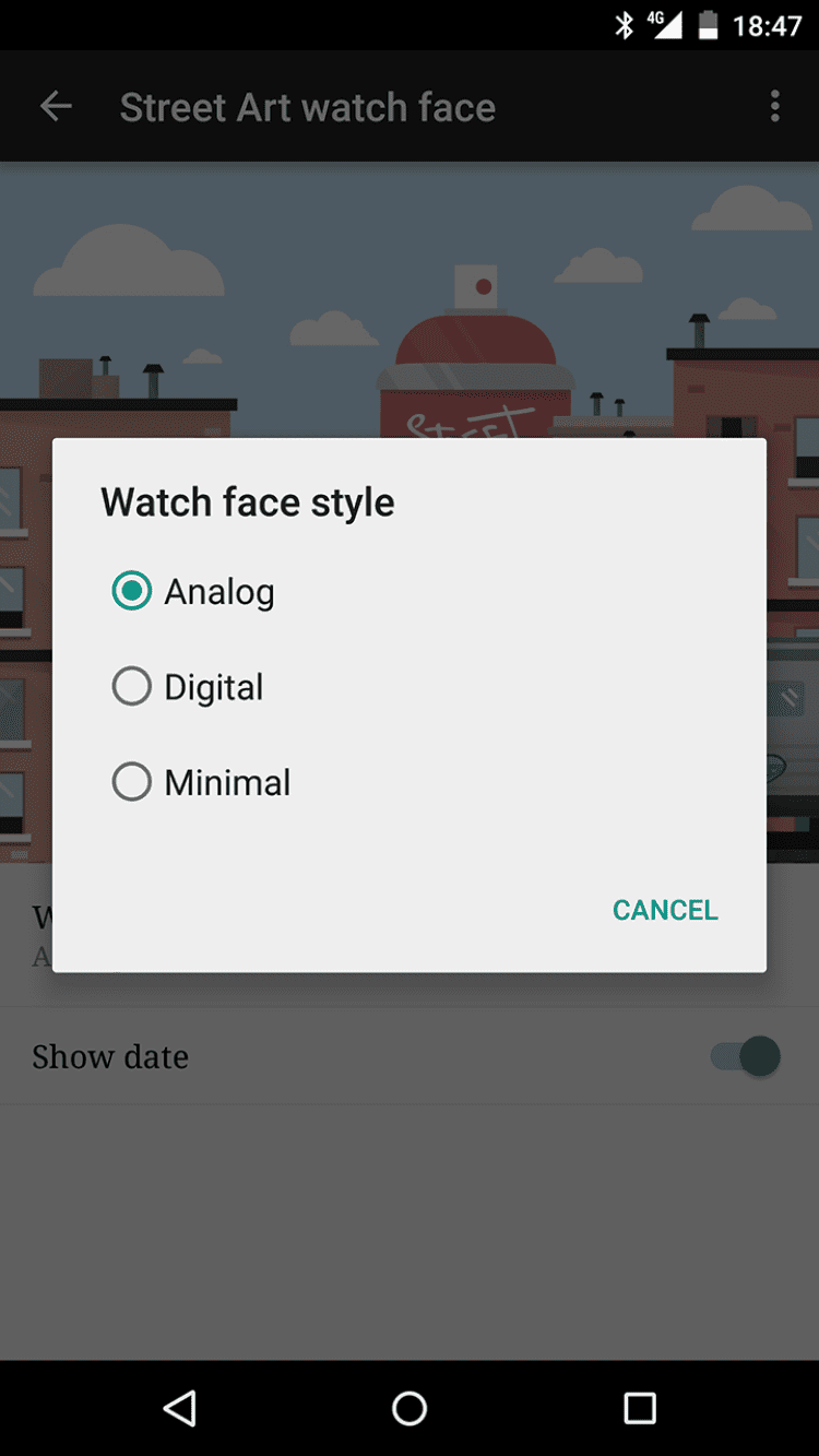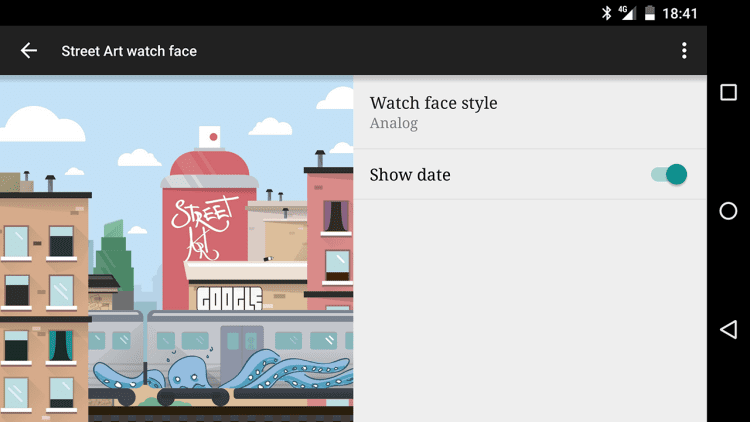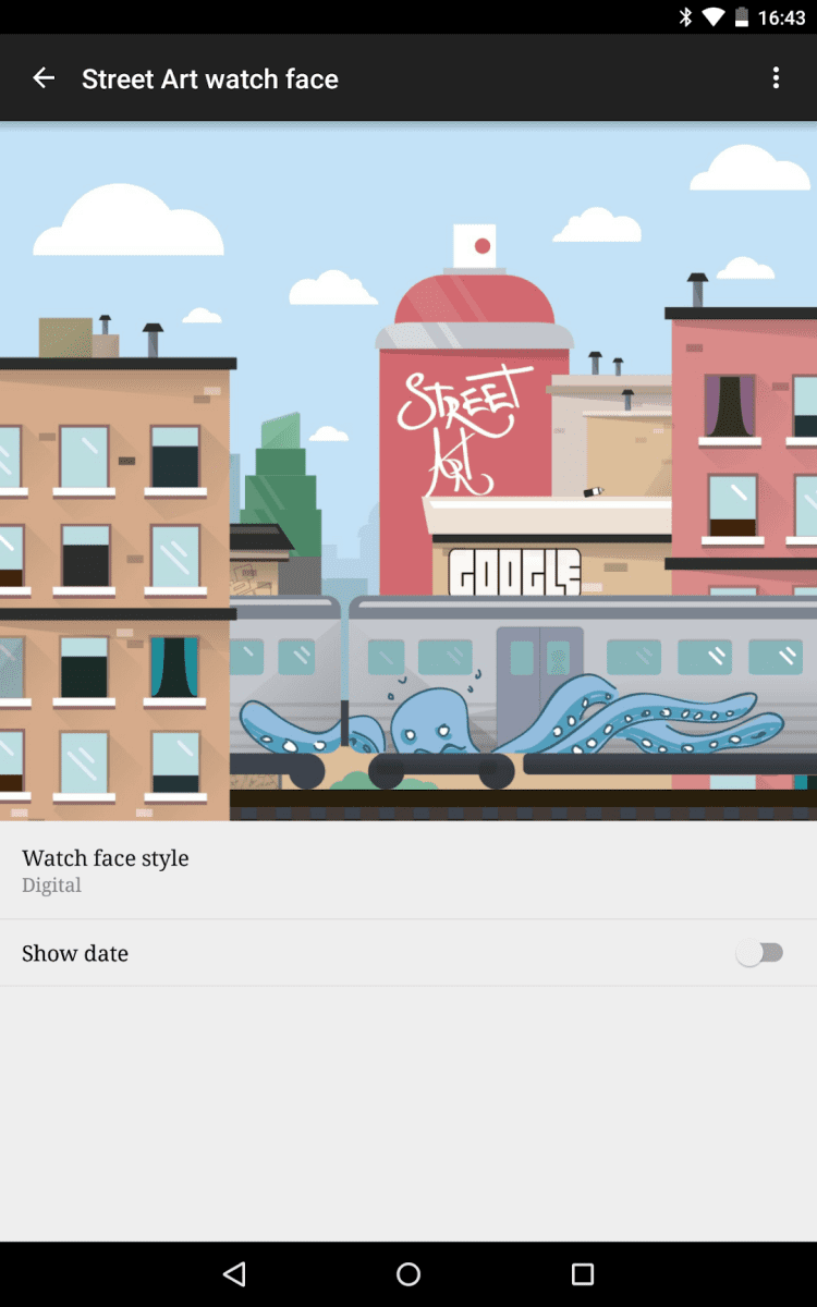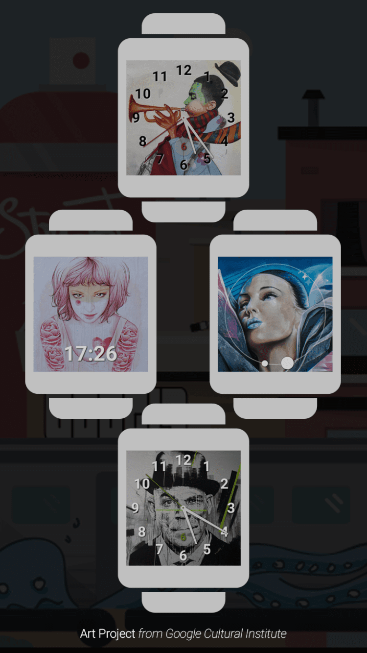 Стрит-арт — коллекция красивых циферблатов, выполненных в стиле стрит-арт, предназначенная для умных часов на Android. В приложении содержатся работы группы художников проекта Google Art Project: Aitch, Andre Fernandes Trindade, Cheko, DRAW, Drawing Jesus, Erik Otto, Gemeniano Cruz, God Mess, Hugo Lucas, Katch, L Is Not An Artist aka Luísa Cortesão, Mariana Dias Coutinho, Mercedes deBellard, Mercedes deBellard & Cheko, Nark, Nicolae Negura, Paulo Arraiano, Pedro Batista, Phibs, Reach, Samina, Slap, Sublinismo & Cheko, Tamara Alves & José Carvalho, The Empty Belly, Tinta Crua и Will Barras.
