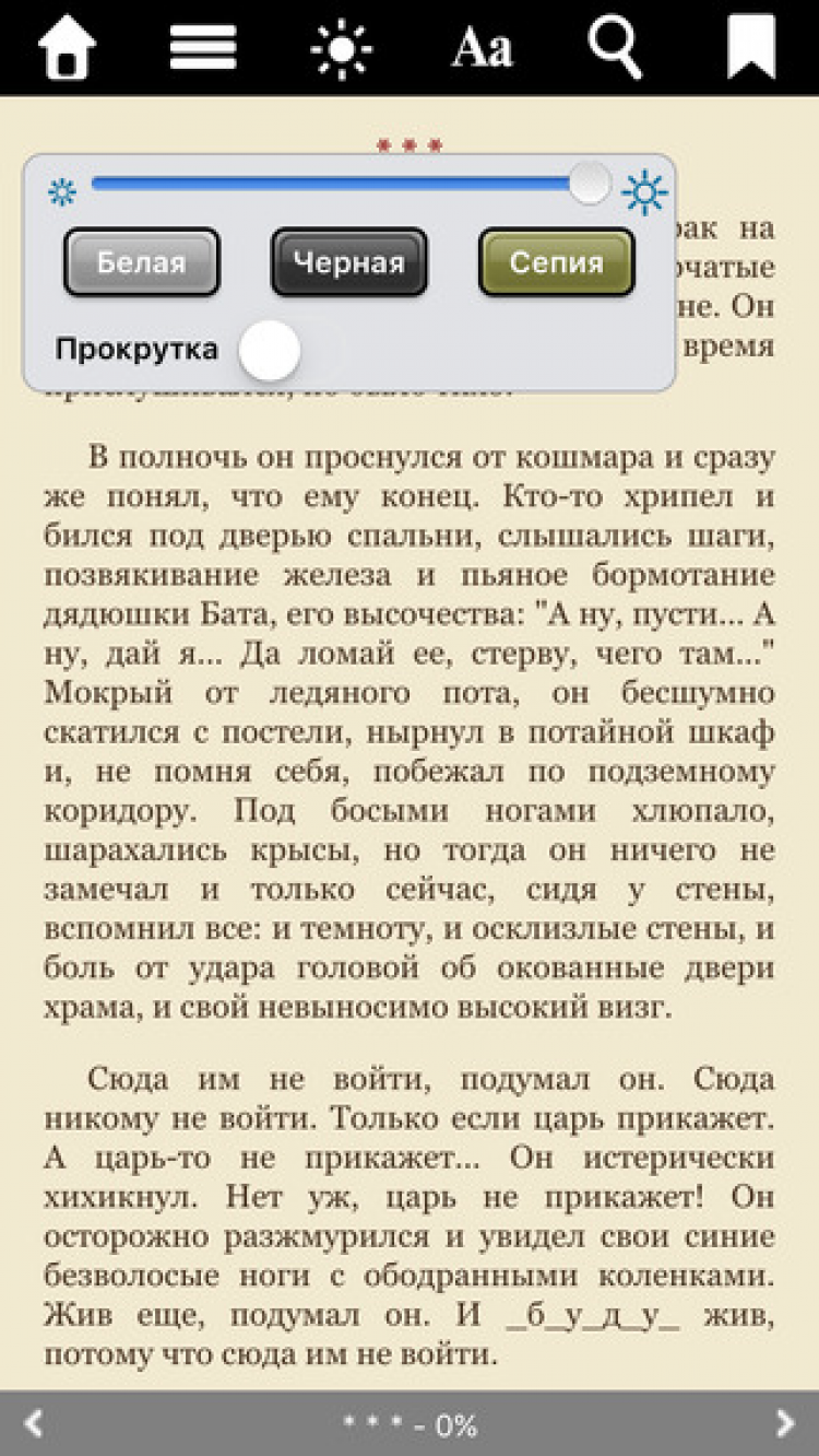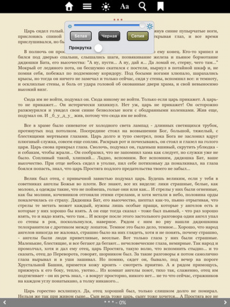 - три режима чтения - "день", "ночь" и сепия;