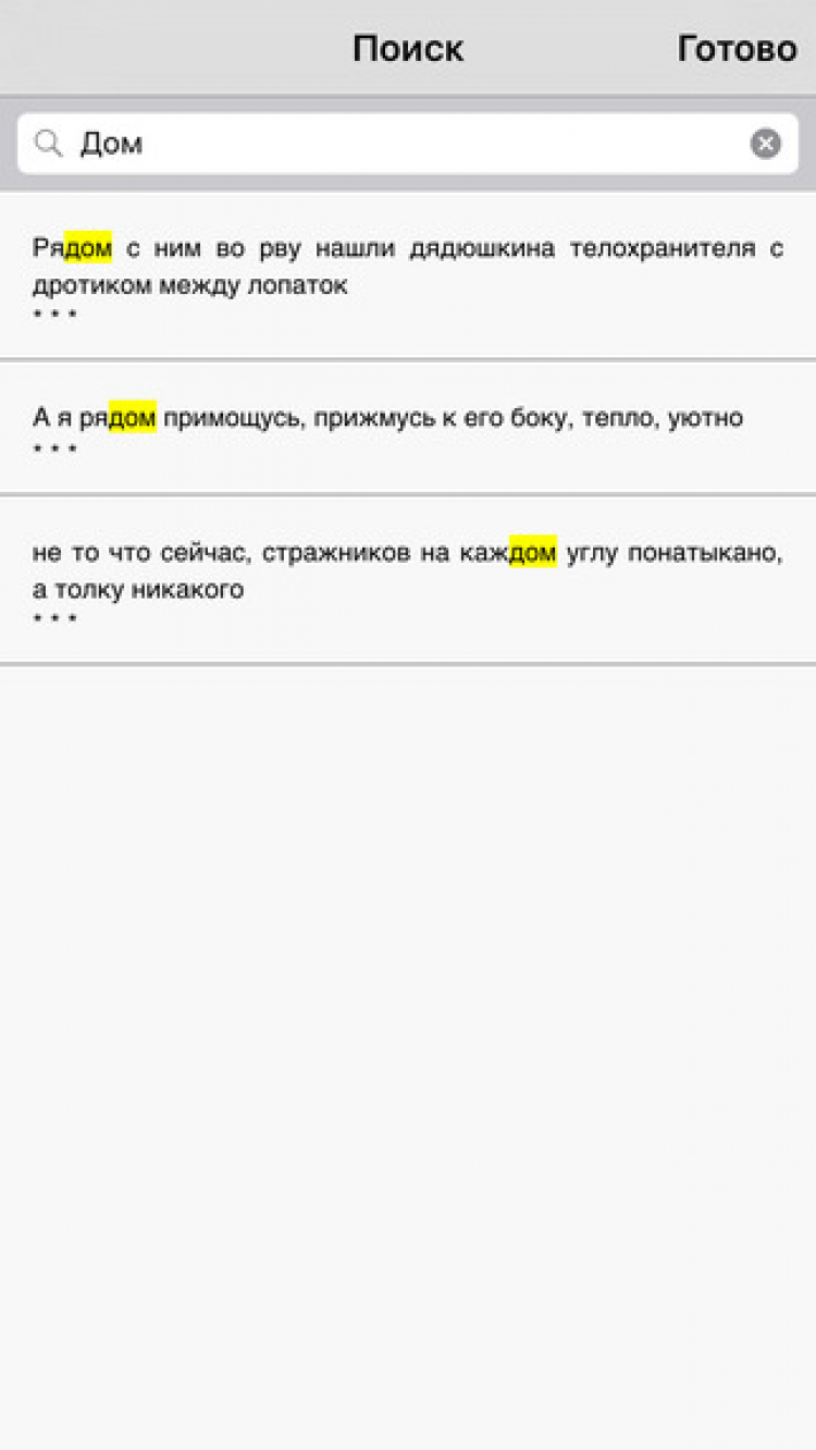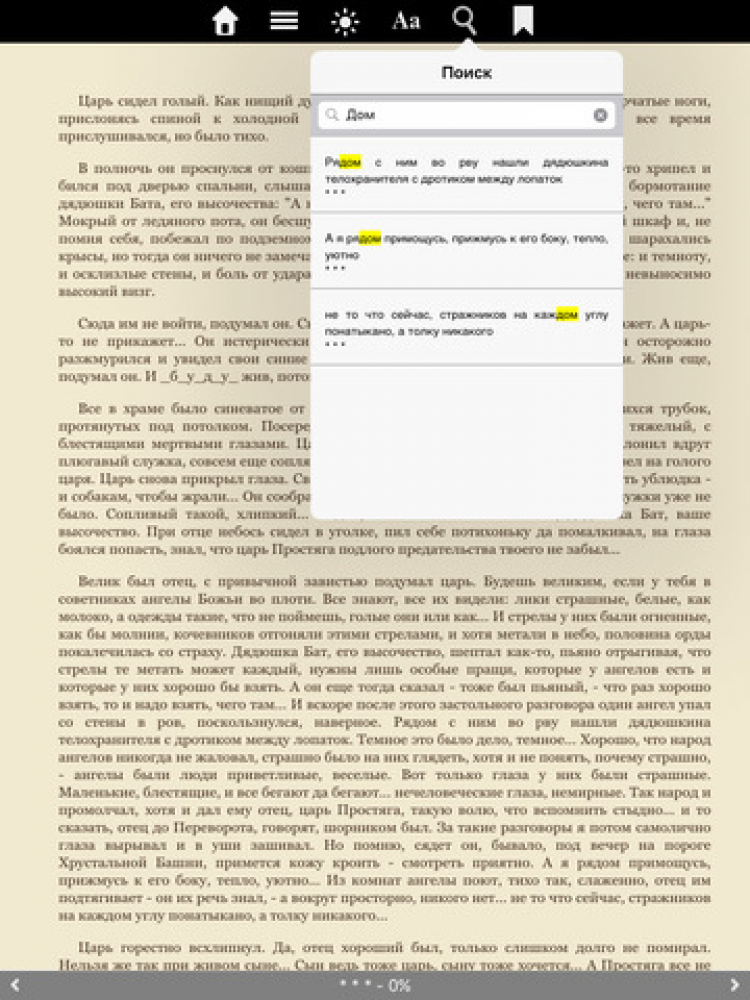 , - автоматическое сохранение места, на котором остановлено чтение; - закладки; - поиск в книге по части слова, слову и словосочетанию; - поиск по содержанию.