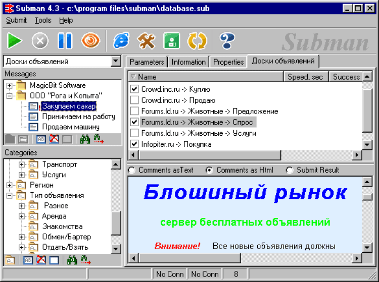 Subman - это мощный менеджер рассылок. Просмотр досок объявлений и рассылка сообщений по ним, удобный рубрикатор, выбор досок по любым критериям, простейший механизм добавления своих ресурсов. Полный контроль работы, как в процессе рассылки, так и после нее. Наглядные, настраиваемые отчеты о рассылках. Автоматическое пополнение базы данных с сервера разработчика. Защита от спама.