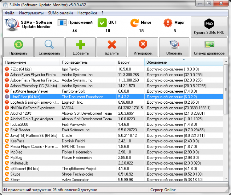 Благодаря данной утилите, на вашем компьютере всегда будут установлены самые свежие версии программ. Данная версия SUMo доступна бесплатно. В платной версии есть пара дополнительных функций: переход на официальный сайт программ из списка обновлений и ряд других.