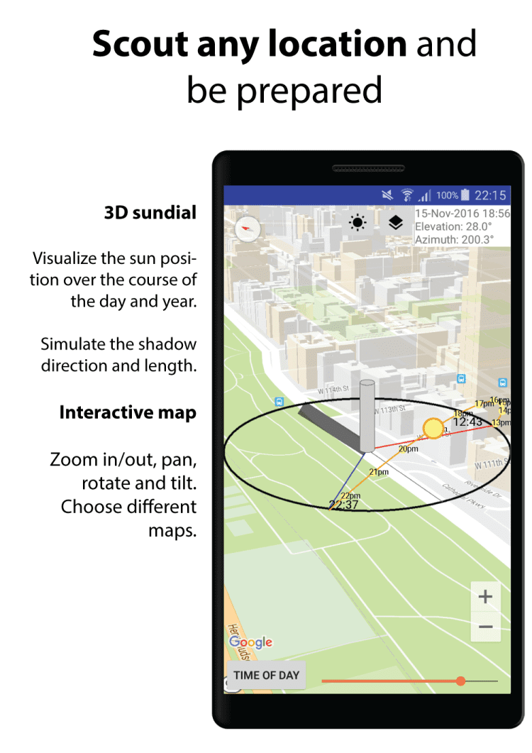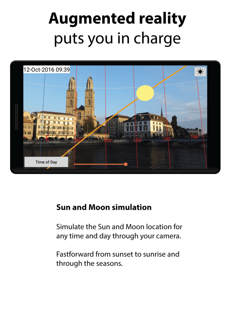 В последней версии приложения, вы можете проверять информацию о положении Солнца и Луны для своего города и другого места на карте. Для этого, можно воспользоваться GPS для поиска вашего местоположения. указать на карте, или ввести координаты. Наиболее важные места можно сохранить в персональном списке избранного и переключаться между ними в любой момент. Положение небесных тел можно получить как в текстовом варианте, так и наложив его на изображение с камеры мобильного телефона. Интересно, что приложение позволяет получать точную информацию как на текущий момент, так и на любое выбранное вами время.
