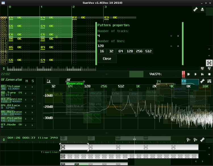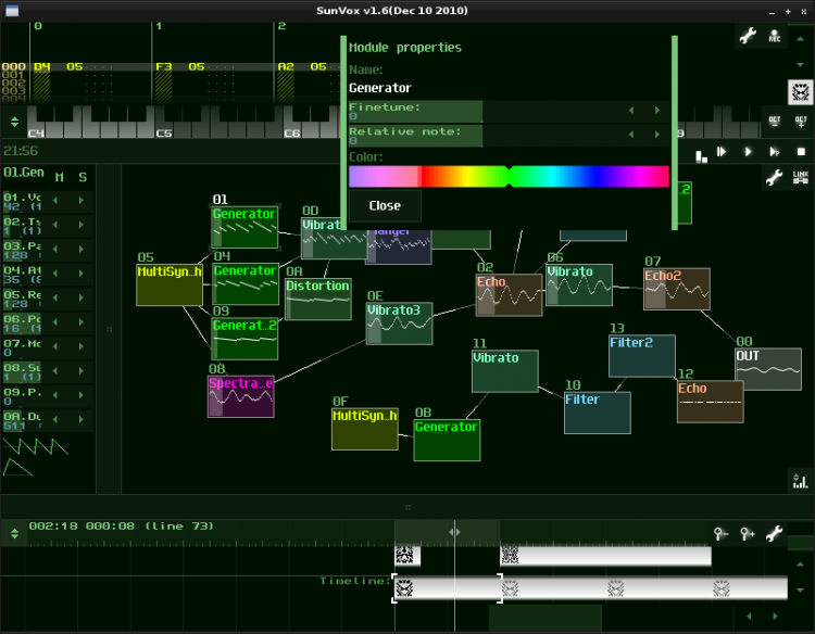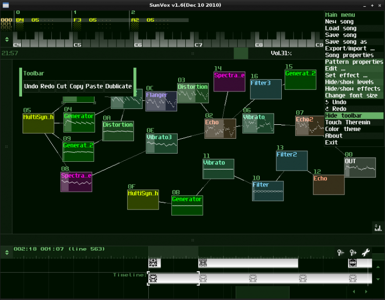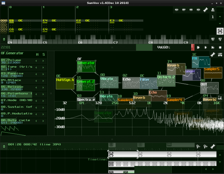 - оптимизированные алгоритмы синтеза; SunVox почти без изменений работает, как на мощных компьютерах (32-битный звук), так и на слабых КПК и смартфонах (16-битный звук);