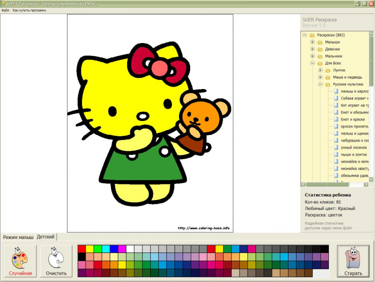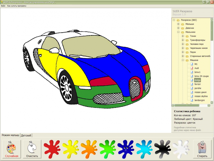 - В программе раскраска ведется статистика по лучшему разукрашенному рисунку, по цветам, которые чаще всего используются и общее количество кликов для той или иной раскрашенной картинки. Это будет интересно и полезно знать родителям, чтобы понять интеллектуальное и психологическое развитие ребенка;