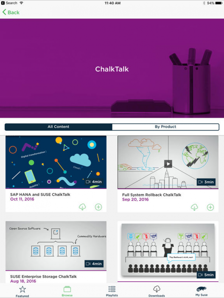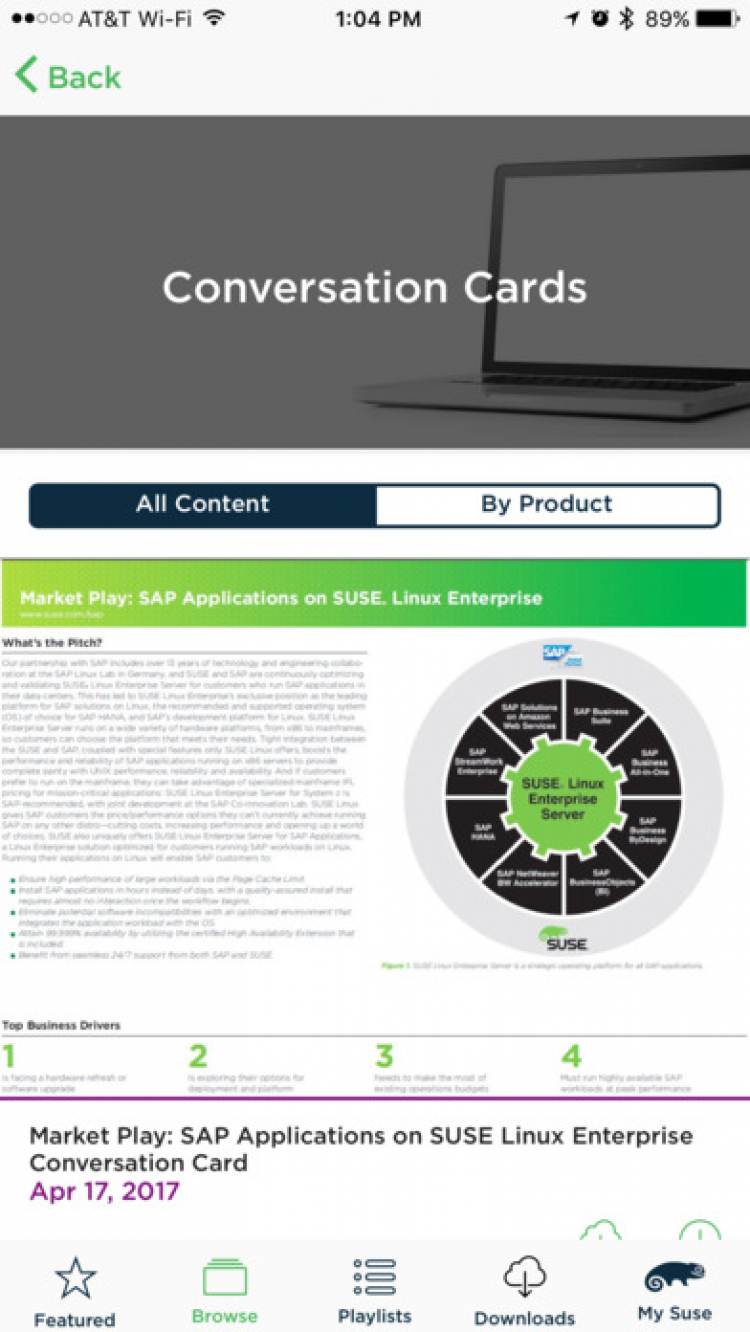 SUSE to Go Программа для мобильных устройств на iOS, которая позволит вам получать последнюю техническую информацию или информацию о продажах в любой момент. Вы сможете получать эту информацию в виде аудио, видео файлов, документов, ChalkTalk, а так же проч.