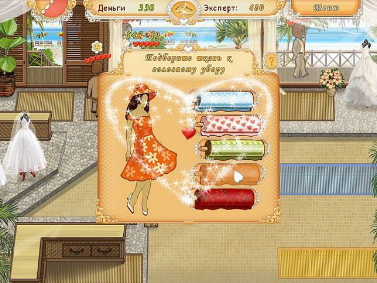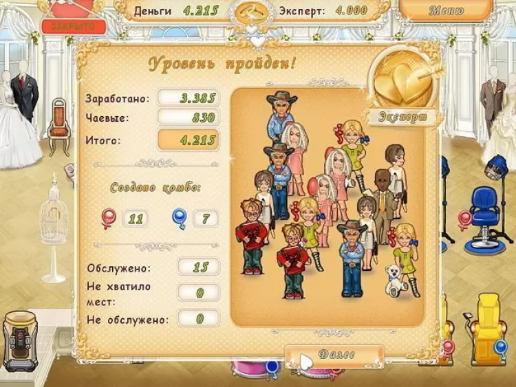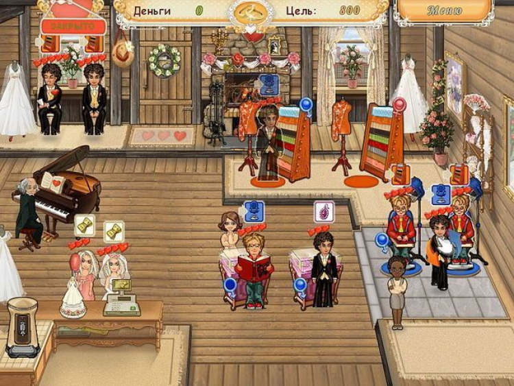 Подружка невесты придирчива и плаксива. Чуть что не так, сразу в слезы. Племянник настоящий ботаник, не расстается с книгами ни на минуту, зато к реальной жизни совсем не приспособлен и понятия не имеет, что ему надеть на свадьбу тети. Учитывайте особенности всех гостей салона, это позволит вам верно расставить приоритеты и действовать оперативно. А довольные клиенты в долгу не останутся: они обязательно оставят хорошие чаевые! Чтобы узнать, какое настроение у посетителя, посмотрите, сколько сердечек над его фигуркой. Прибыль становится все больше, свадебный бизнес растет. Вкладывайте деньги в улучшения: купите новое оборудование и наймите помощников. И дела пойдут еще лучше!