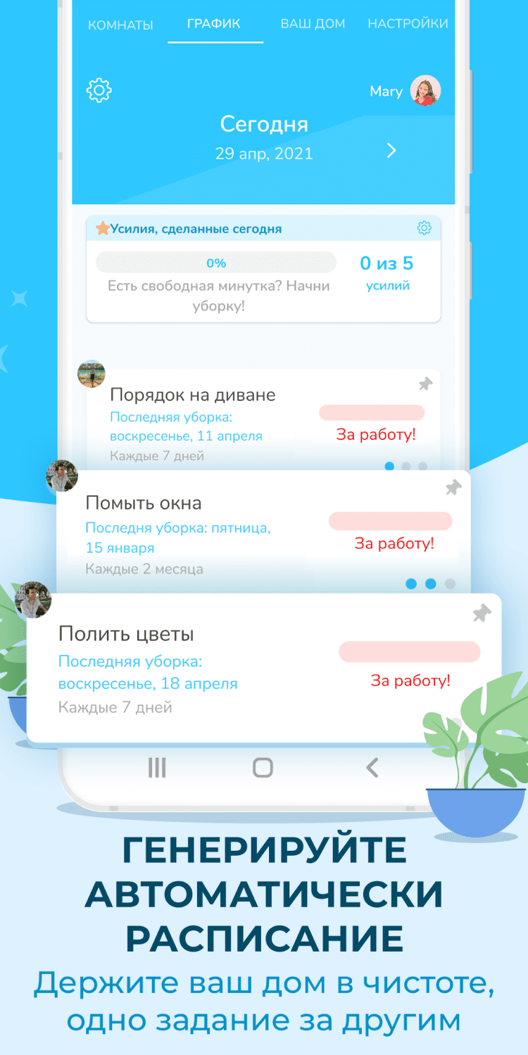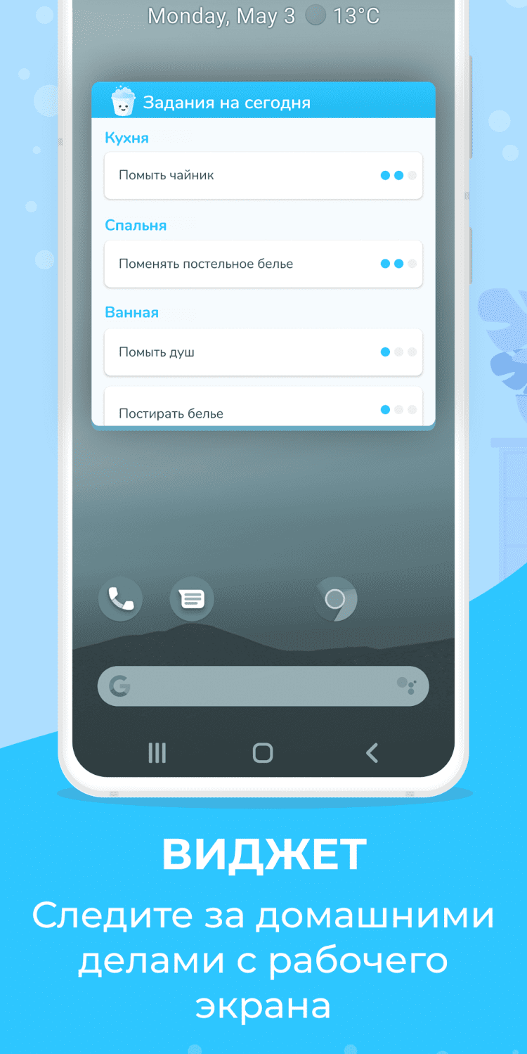 Это приложение станет вашим надёжным помощником в поддержании чистоты и порядка в доме. Всё, что для этого необходимо — это добавить в программу нужные комнаты и добавить задания. К примеру, это может быть "Спальня" с задачами "Вытереть пыль", "Поменять постельное белье" и т.д. Для каждой задачи, можно выбрать периодичность, а также текущее состояние. После этого, программа предложит выбрать время для отправки напоминаний. Отмечайте задачи выполненными, распределяйте обязанности между членами семьи и просматривайте графики в удобном и наглядном виде, прямо на экране мобильного телефона.