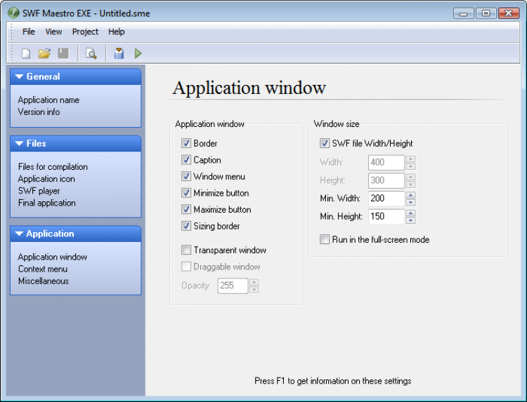 Скомпилируйте исполняемый файл и поместите в него так много используемых и вспомогательных файлов, сколько хотите, включая XML, FLV, MP3, JPG, и другие поддерживаемые файлы любого типа. SWF Maestro EXE не оставляет лишних следов. Ваши клиенты никогда не увидят никаких окошек с сообщениями в духе Сделано при помощи... Вы контролируете каждый аспект своего SWF-проекта. Создавайте оконные и полноэкранные презентации и игры, и измените приложение на свое усмотрение вместе с заголовками, иконками и ресурсами.