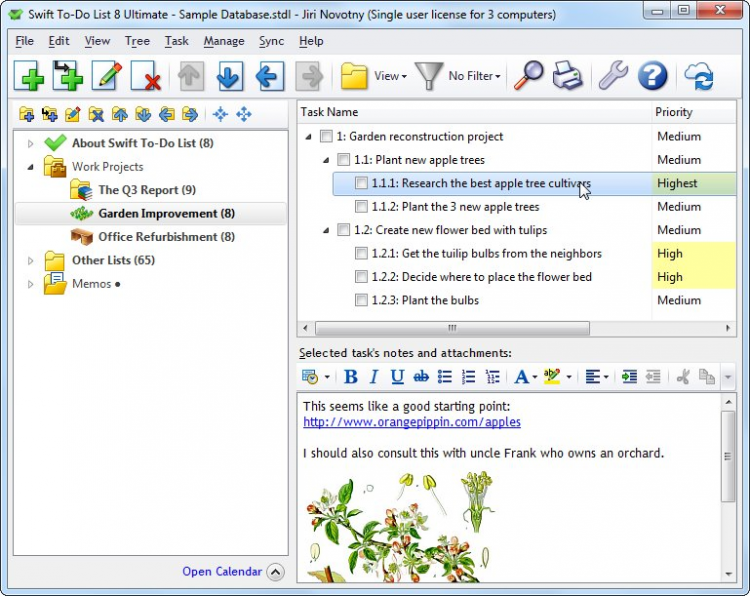 - множество различных полей (Task Name, Priority, Type, Due Date, Start Date, Completion Date, Context и т.д.);