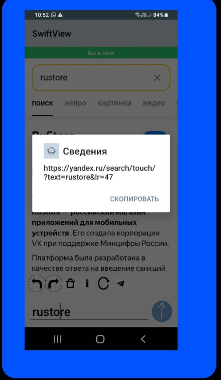 SwiftView - лёгкий браузер, созданный 9 января 2025 года. Он лёгкий, компактный, имеет дизайн похожий на Chrome. Интерфейс на русском. После экрана загрузки открывает главную страницу и офицальный сайт браузера. Ищет в 2.0 пока только по яндексу. Браузер поддерживает только русский язык.