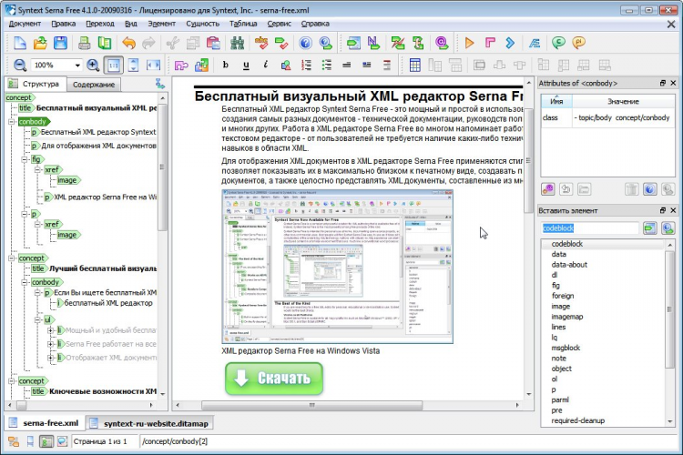 Syntext Serna Free Это мощный и простой в использовании редактор для создания самых разных документов - технической документации, руководств пользователя, статей, книг и многих других.