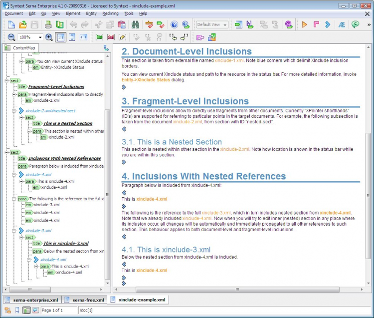 Для отображения XML документов в XML редакторе Serna Free применяются стили XSLT и XSL-FO, что позволяет показывать их в максимально близком к печатному виде, создавать профилированные виды XML документов, а также целостно представлять XML документы, составленные из множества частей.