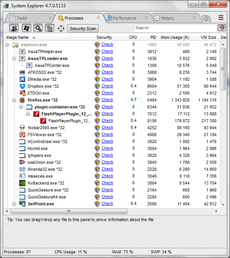 System Explorer имеет удобный, понятный пользовательский интерфейс. Все инструменты программы располагаются на отдельных вкладках. Вкладки можно открывать, закрывать и перемещать. В программе имеются инструменты для мониторинга различных областей ОС Windows, включая запущенные приложения, активные процессы, сетевую активность, загруженность компонентов компьютера (ЦП, оперативная память и т.д.) и многое другое.