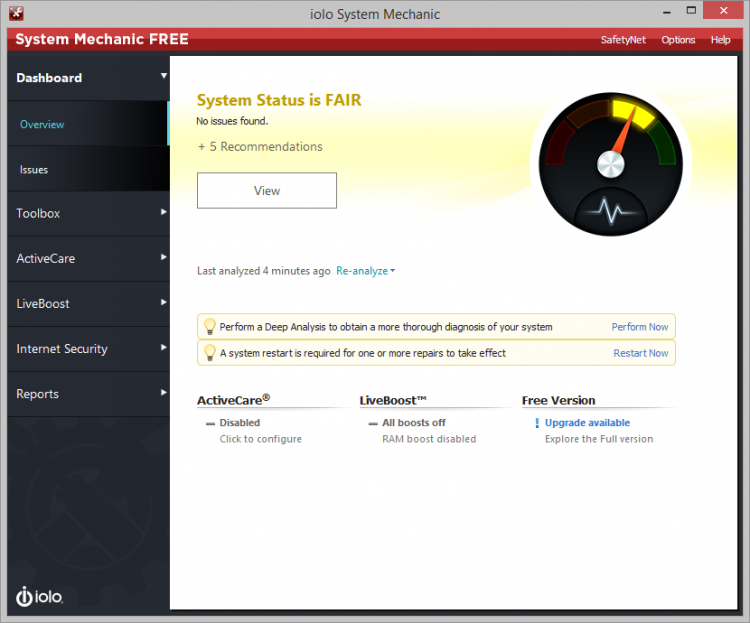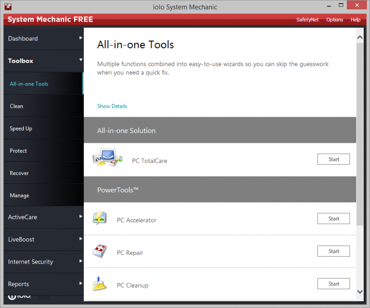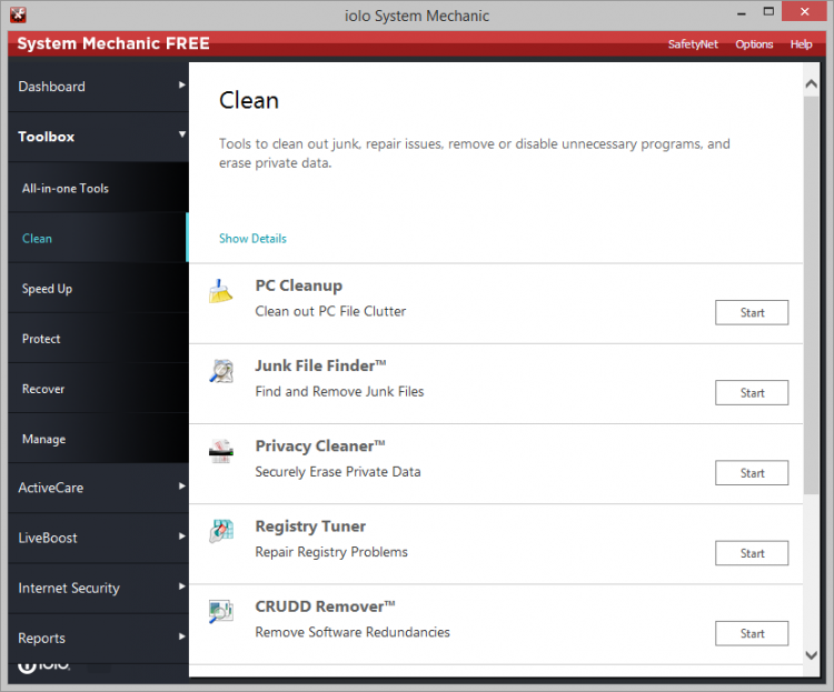 Рассмотрим функциональные возможности и свойства пакета приложений System Mechanic
