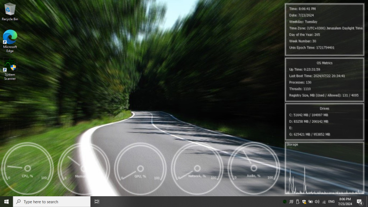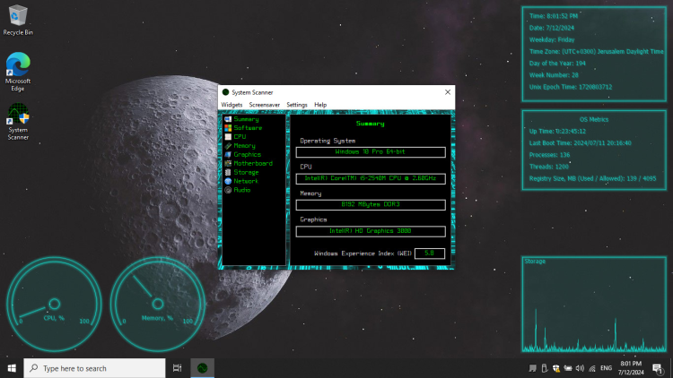System Scanner показывает базовую информацию об аппаратном и программном обеспечениях компьютера, а также о показателях работы системы. С помощью программы пользователь сможет узнать характеристики операционной системы, центрального процессора, оперативной памяти, видеокарты, жёсткого диска, материнской платы и прочих комплектующих ПК.