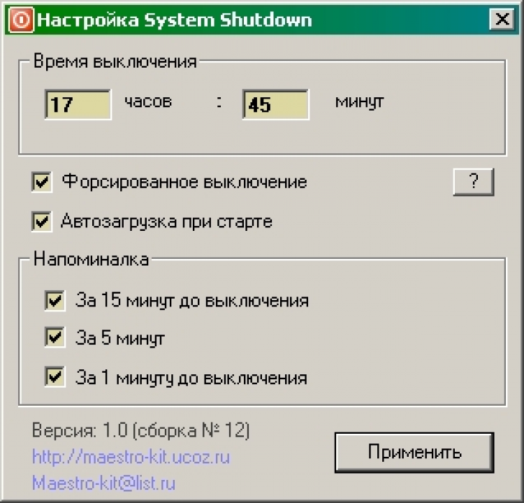 System Shutdown System Shutdown это компактная и простая программа, предназначенная для выключения компьютера по расписанию или таймеру. Она может автоматически выключить компьютер в указанное пользователем время. Есть режим форсированного выключения компьютера. Перед выключением компьютера System Shutdown предупредит пользователя, дав возможность сохранить свою работу.
