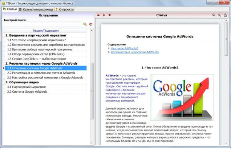 T2Book T2Book – это электронная версия проекта T2Money.ru. Здесь есть каталог статей по теме онлайн-бизнеса. В программе имеются следующие инструменты: калькулятор дохода, поисковая система и функция вывода на печать. Дополнительно в T2Book есть раздел, содержащий обучающие ролики из Интернета.