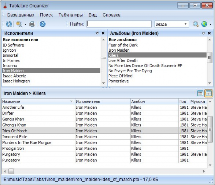 Tablature Organizer - это предназначен для удобной навигации по коллекции гитарных табулатур. Программа сканирует каталоги, содержащие табулатуры, считывает из них информацию о названии / исполнителе / альбоме / авторах слов / музыки и заносит её в базу данных. Интерфейс Tablature Organizer позволяет просматривать списки табулатур сгруппированные по исполнителю/альбому и производить поиск по коллекции. Также есть возможность поиска в интернет-архивах гитарных табулатур и выполнение SQL-запросов.
