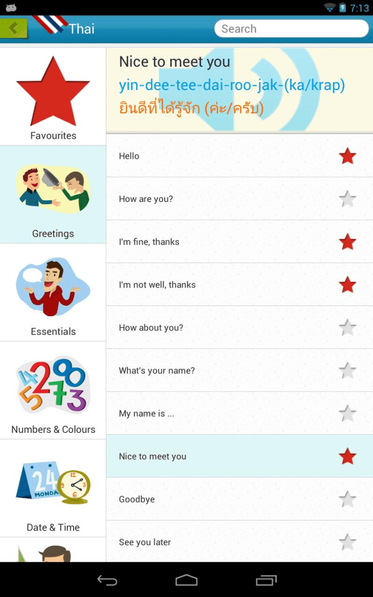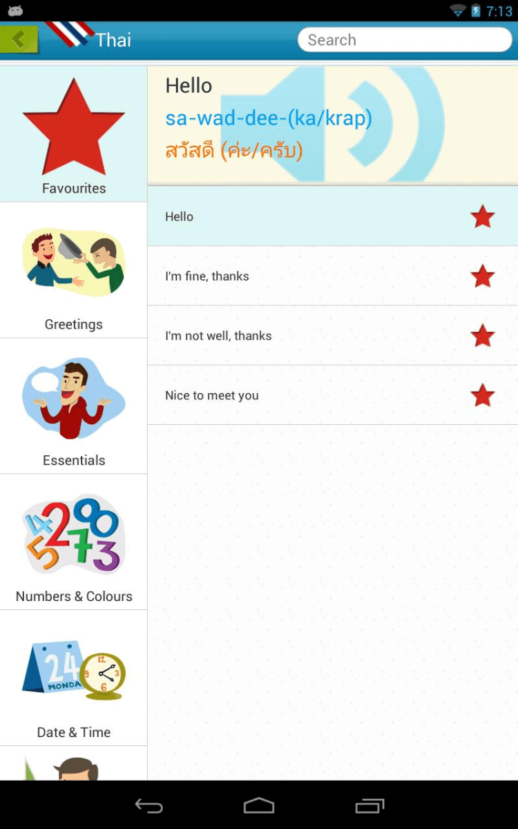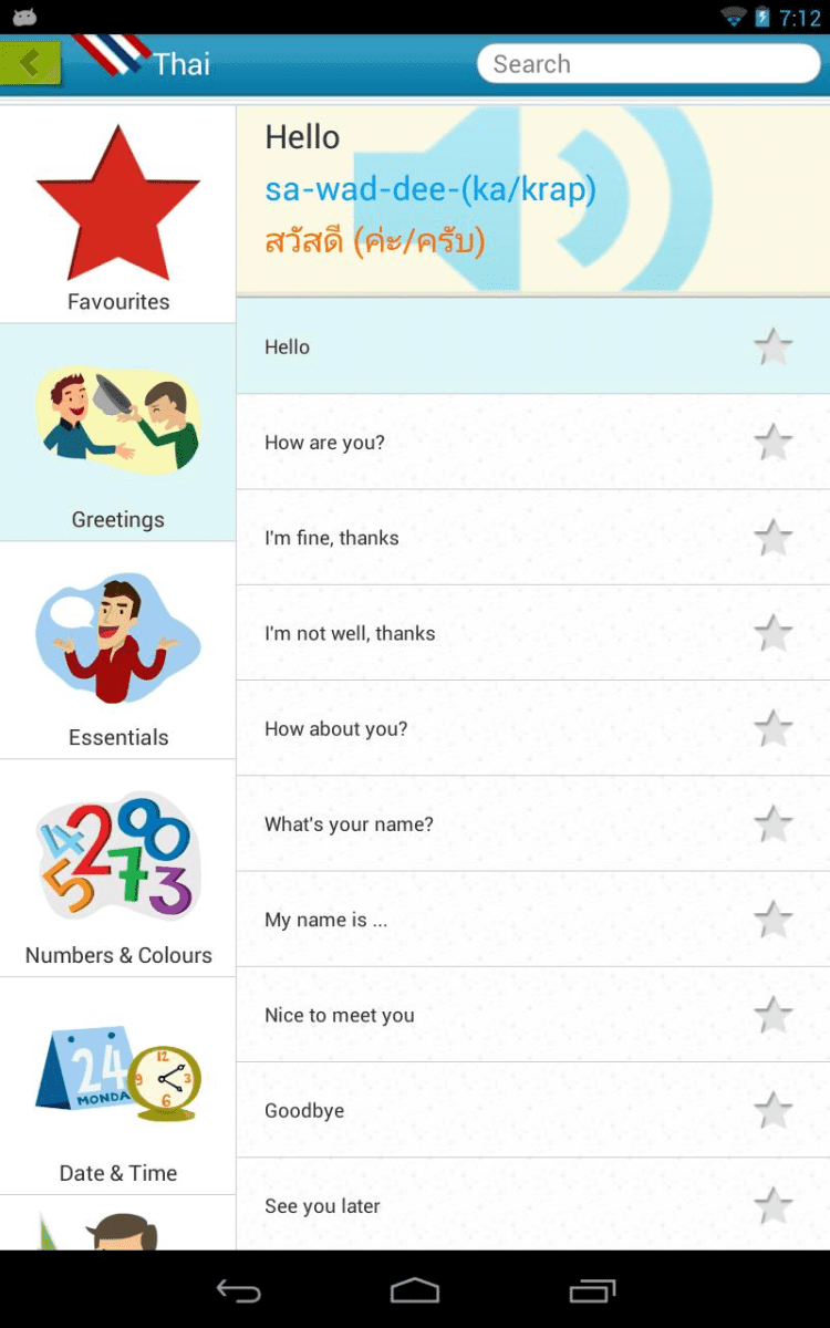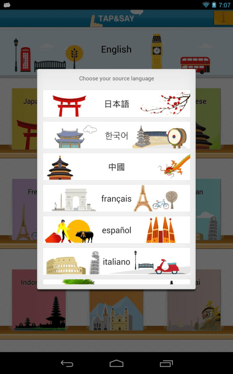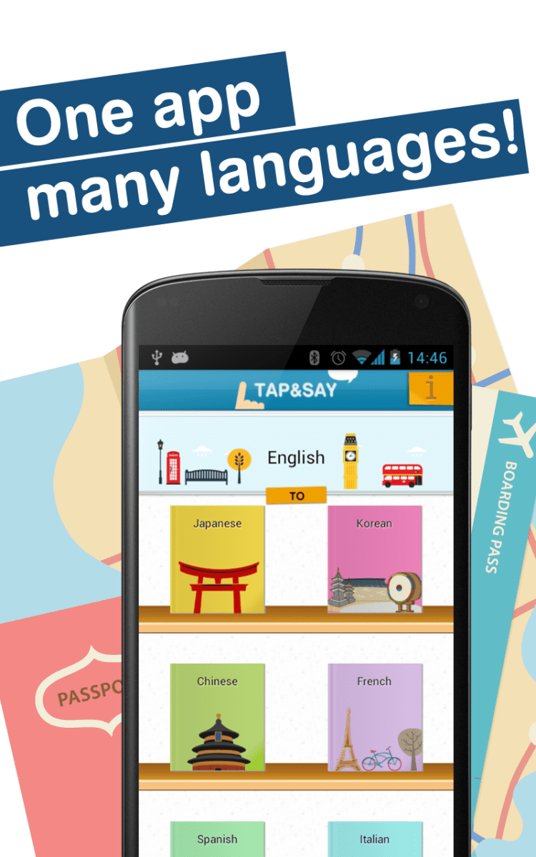 Tap & Say - Travel Phrasebook Незаменимое приложение-разговорник для путешествий по всему миру. В нем вы найдете разговорники по 11 языкам мира, с набором из более чем 600 самых полезных фраз и выражений с переводами. В программе реализована функция поиска, добавления фраз в список избранного, а так же голосовой ввод.