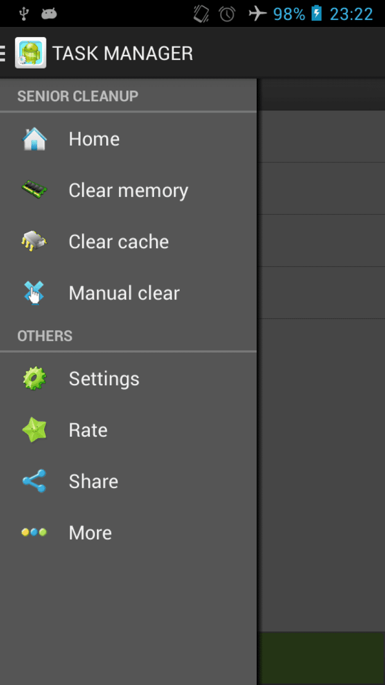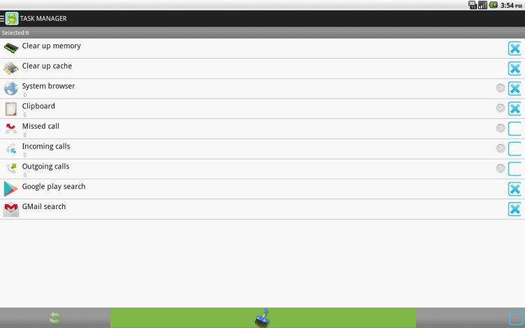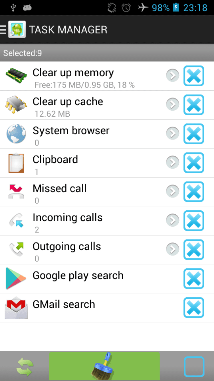 TaskManager-MobilePhoneSpeedup Удобный менеджер задач, обладающий функцией автоматической очистки кэша при перезагрузке устройства и уведомляющий о достижении свободной памятью отметки в 10%. Помимо этого, TaskManager-MobilePhoneSpeedup позволит вам быстро очистить историю запросов в Google Play, Gmail, Google Maps, Google, YouTube, Chrome, историю загрузок, входящих, исходящих и пропущенных звонков, буфер обмена, а так же кэш приложений.