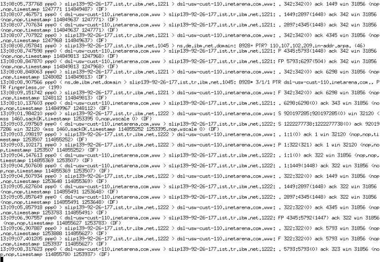Часть отображения пакетов выбирает захваченные пакеты по одному из буфера, заполняемого библиотекой, и выводит их (в воспринимаемом человеком виде) на стандартный вывод построчно, в соответствии с заданным (в командной строке) уровнем детальности.