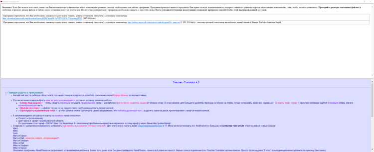 Teacher - Translator - это программа - Учитель английского, c ней легко научиться читать, разговаривать и переводить различные тексты. Чтобы увидеть перевод и услышать произношение слов,- достаточно просто вести указатель мышки от слова к слову. New - 9 новых потрясающих по качеству голосов.