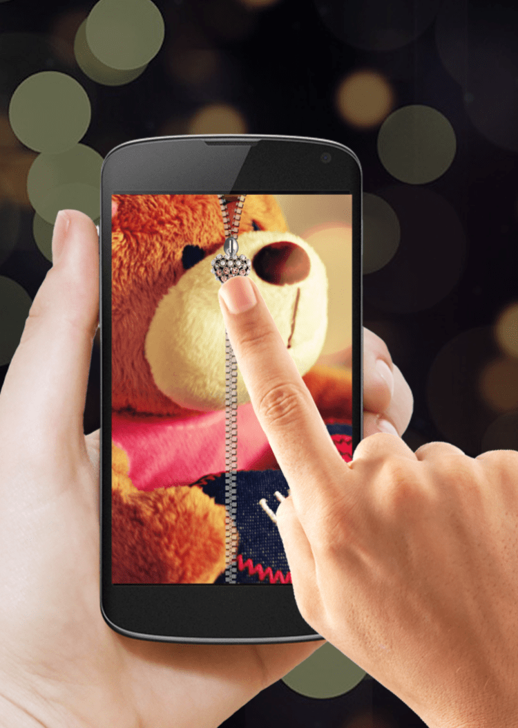 Teddy Bear Zipper Lock — это сменный экран блокировки для Android-устройств, оформленный в стиле изображения игрушечного медвежонка на молнии. Для того, чтобы разблокировать устройство, необходимо всего лишь расстегнуть молнию, проведя по ней пальцем вниз.