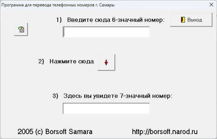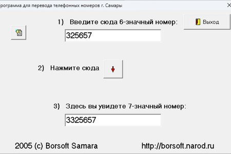 Телефон Самара - это программа для перевода номеров шестизначной нумерации в семизначную. Пока только для Самары... Но при желании возможны расширения. Программа полезна для пользователей ноутбуков, когда лень запоминать замены номеров, можно запустить программу, набрать номер и получить результат!