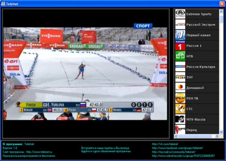 TeleInet - это программа для просмотра телевизионных программ на компьютере через сеть Интернет. Простой, понятный интерфейс не требует установки и регистрации. Транслирует более 150 каналов. Имеется возможность полноэкранного режима. Все изменения и ошибки в трансляции отслеживаются и устраняются на сервере. Программа TeleInet предоставляет возможность просматривать программы не видя рекламы, размещенной на сайте агрегатора при этом вести свой список избранных каналов.