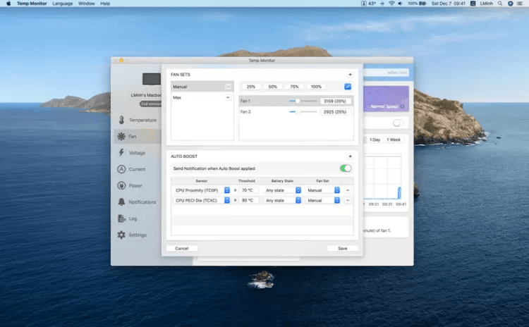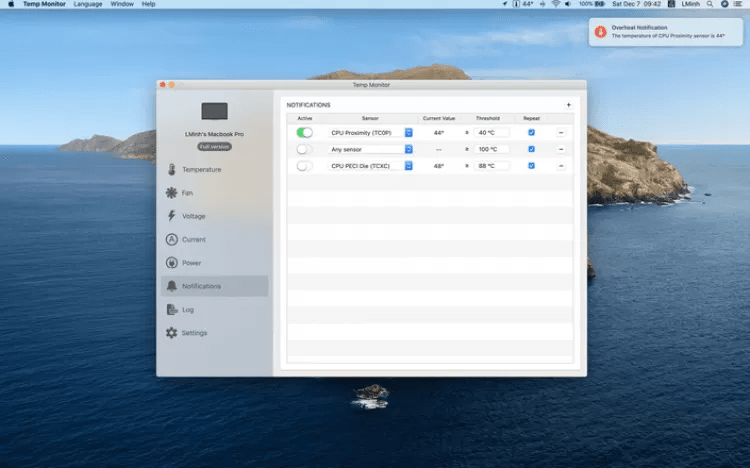 Приложение работает в фоновом режиме, следит для процессором и сообщает если его температура поднимается до критической отметки. Критическое значение температуры, при котором будет выводиться уведомление можно установить в окне настроек. Утилита задействует звуковые и визуальные оповещения Центра уведомлений системы.