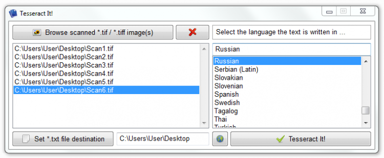 Tesseract It! очень проста в использовании и не требует дополнительных настроек. Вам нужно просто добавить в программу *.tiff/*.tif. файлы, и указать папку для сохранения текстового файла для сохранения распознанного текста. Tesseract It! "понимает" текст на 47 языках.