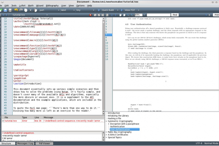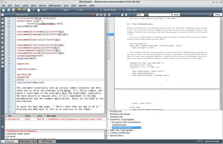Texmaker позволяет форматировать текст и готовить многостраничные документы к печати. Редактор предоставляет возможность работы с библиографическими списками, оглавлением и другими атрибутами профессионального оформления. В Texmaker есть так же возможность конвертирования документов в различные форматы, функции сворачивания блоков кода и автозавершения кода, встроенный просмотрщик PDF документов и многое другое.