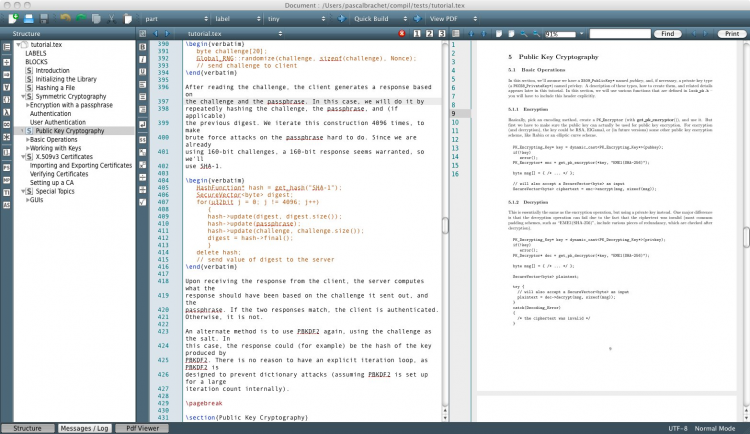 Texmaker позволяет форматировать текст и готовить многостраничные документы к печати. Редактор предоставляет возможность работы с библиографическими списками, оглавлением и другими атрибутами профессионального оформления. В Texmaker есть так же возможность конвертирования документов в различные форматы, функции сворачивания блоков кода и автозавершения кода, встроенный просмотрщик PDF документов и многое другое.