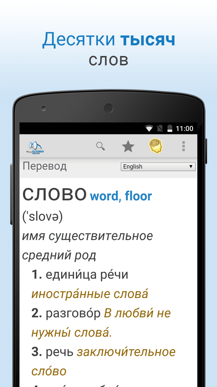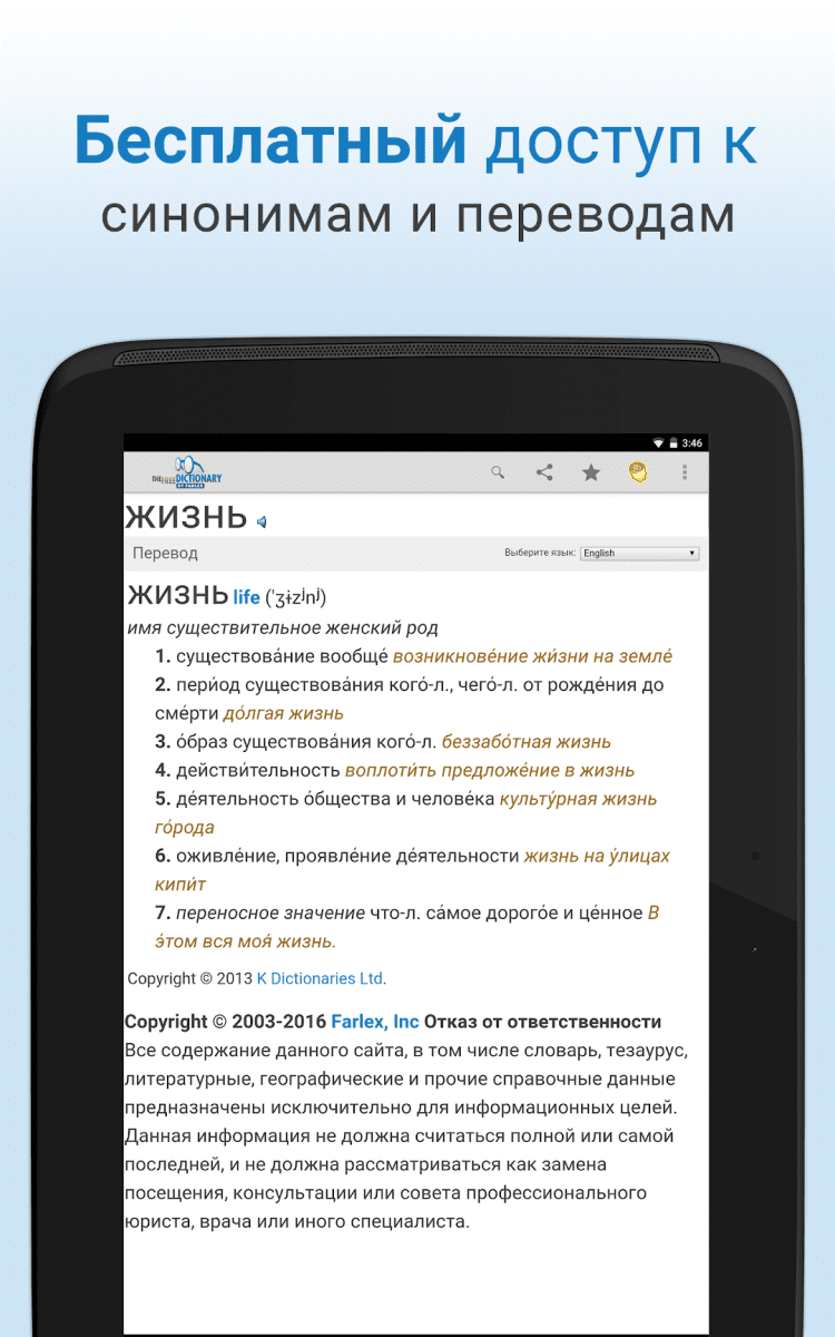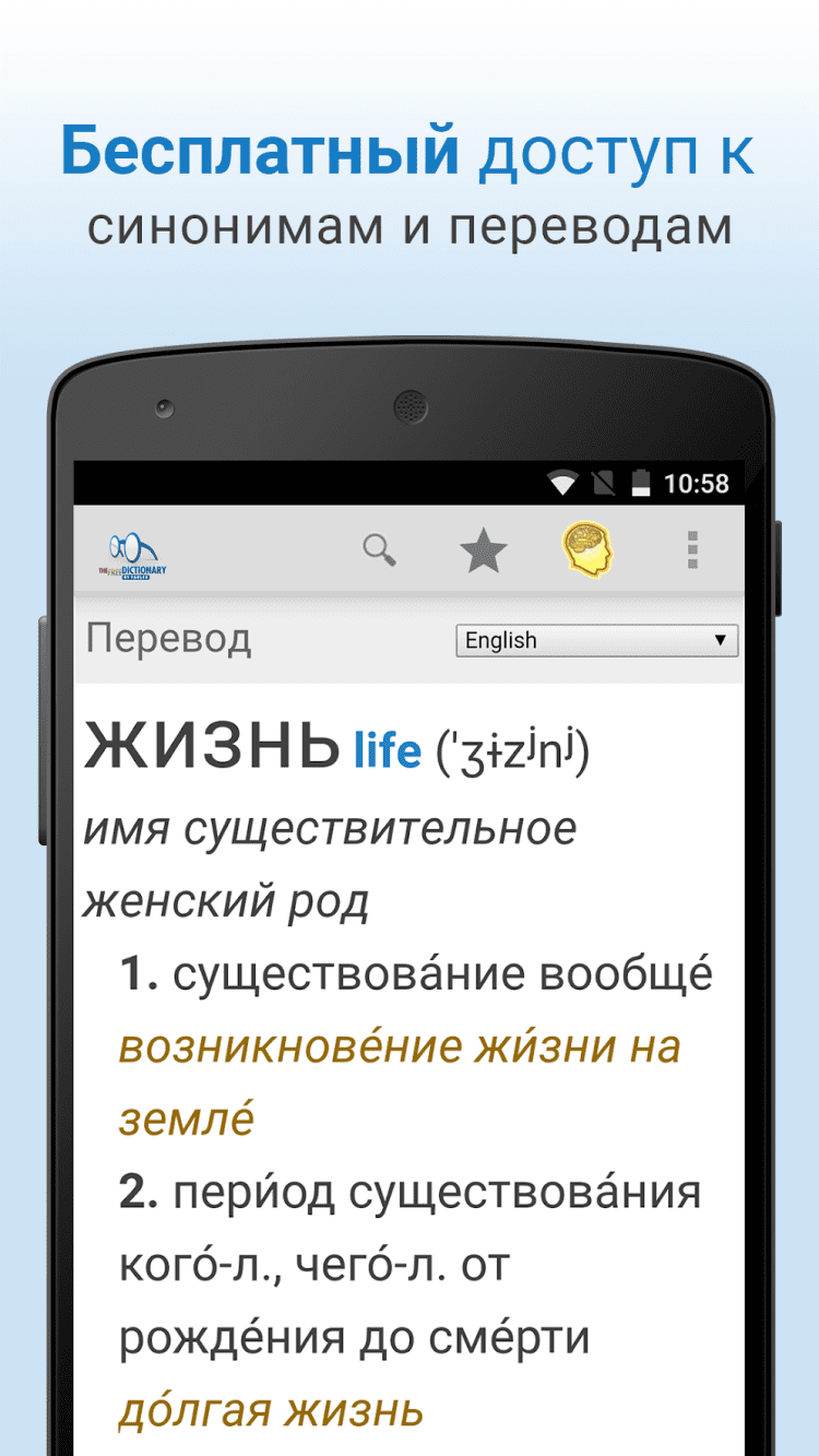 The Free Dictionary — это удобный словарь для мобильных устройств Android, обладающий поддержкой более чем 40 языков, в том числе английского и русского. Вам доступно огромное количество опций перевода, а так же медицинский, юридический и прочие специализированные словари. Переводами вы сможете делиться с друзьями через социальные сети, по электронной почте или через SMS.