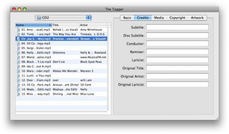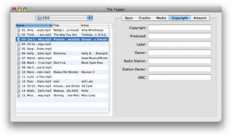 The Tagger Тэг-редактор для AAC и MP3 файлов, который поможет организовать и привести в порядок вашу музыкальную коллекцию. The Tagger обладает необходимым набором функций, облаченных в приятный и понятный интерфейс. Что бы сэкономить ваше время и не править все файлы по очереди вручную, The Tagger умеет автоматически искать информацию о композии на Discogs, и заполнять необходимые поля тэгов. В том числе и обложки альбомов. Отредактированные файлы вы можете экспортировать в iTunes прямо из The Tagger.