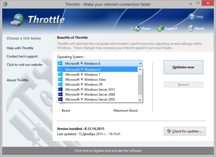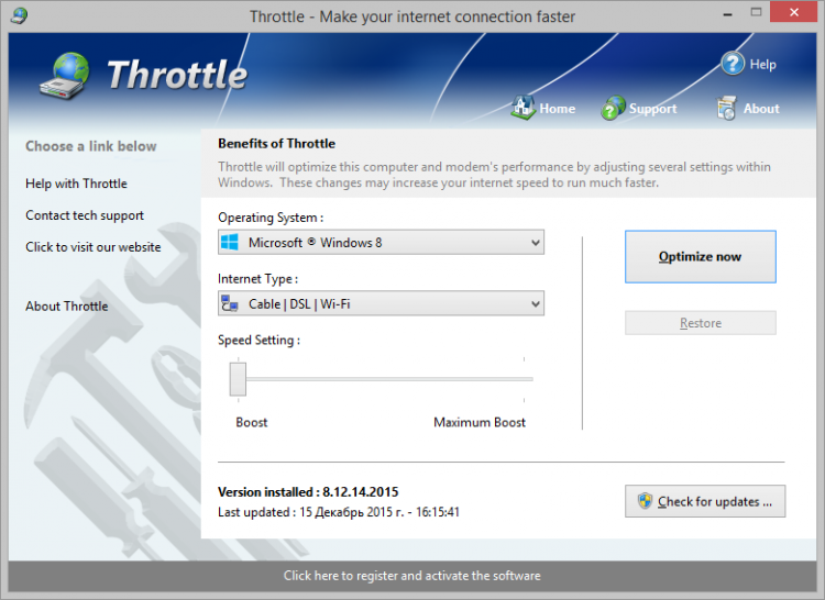 Throttle сделает соединение с интернетом стабильнее, а так же выполнит необходимые настройки для увеличения скорости загрузки страниц и уменьшения лагов при игре по сети, основываясь на версии вашей операционной системы и типе соединения. Помимо базовых настроек, Throttle выполнит изменения в реестре, изменив размер пакетов, которыми компьютер будет обмениваться с удаленными серверами, что поможет сократить задержки перед загрузками страниц и облегчить загрузку различных файлов, даже при небольшой ширине канала. Все изменения, внесенные программой в систему, могут быть быстро и безопасно отменены всего в одно нажатие.