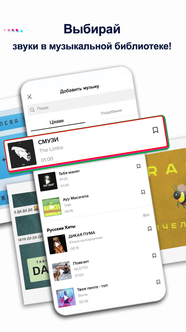 В арсенале программы большой каталог популярных музыкальных треков, нарезок из шоу, комедийных фильмов и мультфильмов, с помощью которых можно воплотить любой творческий проект. Также можно использовать и собственные материалы из памяти планшета или смартфона.