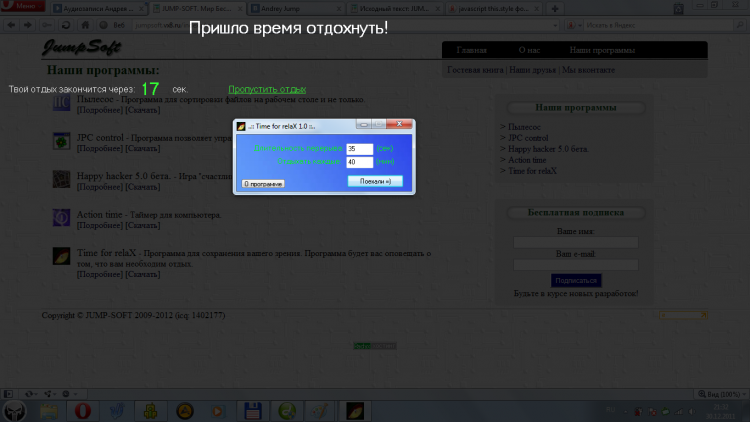 Time for relaX - это программа, которая поможет вам не "загнуться" за компом. Программа будет вас контролировать сидя за компьютером. Будет полезна для людей с плохим зрением и подолгу сидящих за компом.